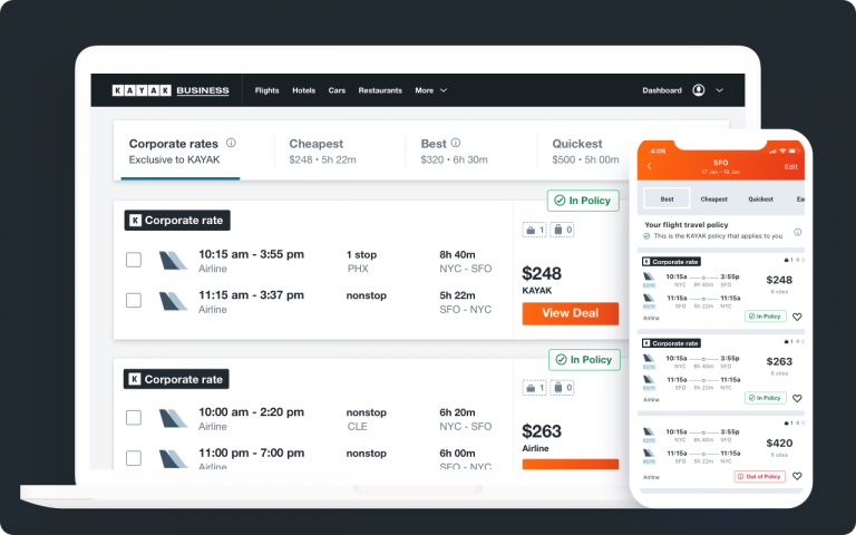 Pohdimme, että bisnesmatkojen varaamiseen pitäisi olla olemassa nykyistä parempi vaihtoehto. Kuten KAYAK-sivusto - helppo ja ilmainen - joka tarjoaa yhden keskitetyn palvelun, jossa suunnitella, hallinnoida ja raportoida bisnesmatkoja (ja mahdollistaa parhaiden tarjousten löytämisen).